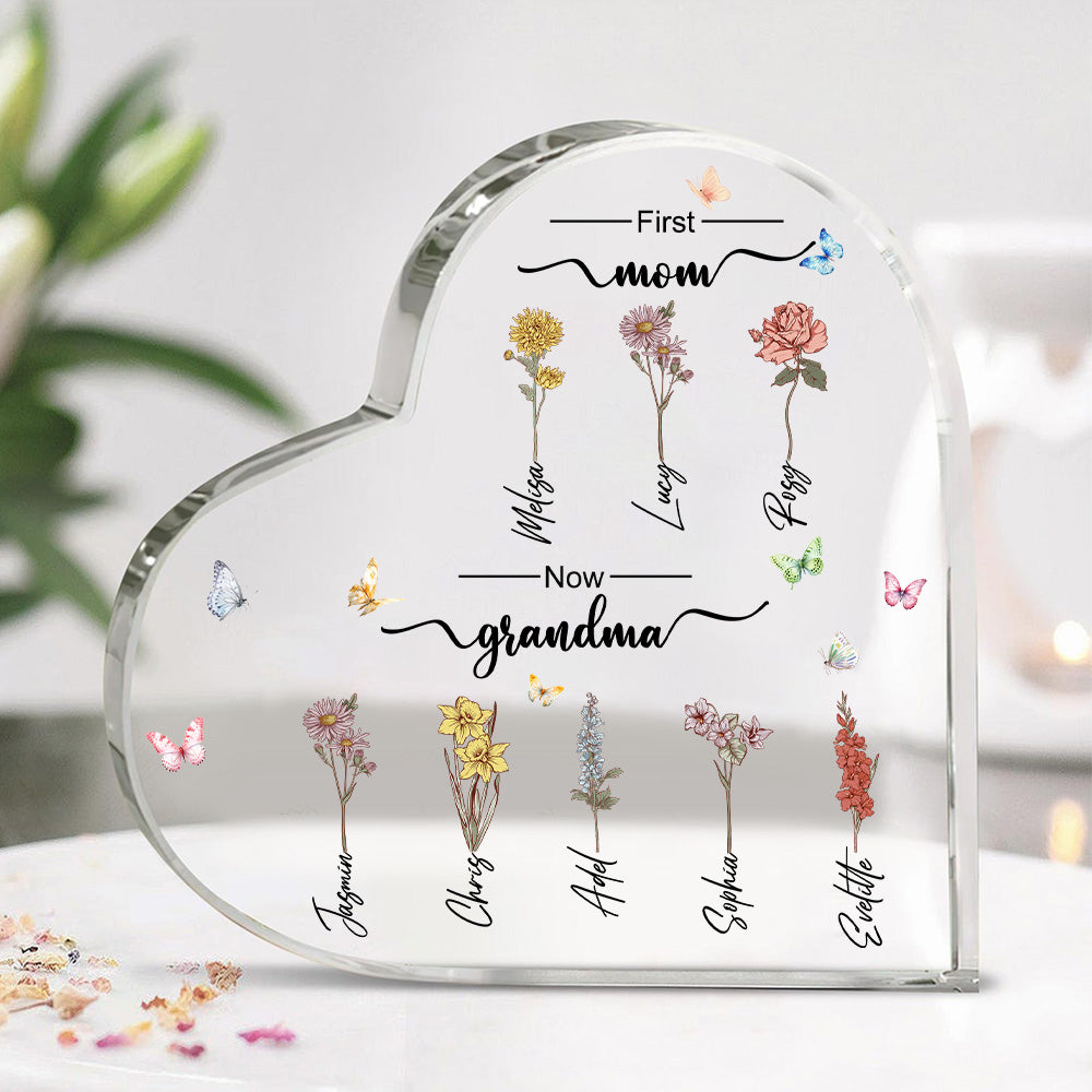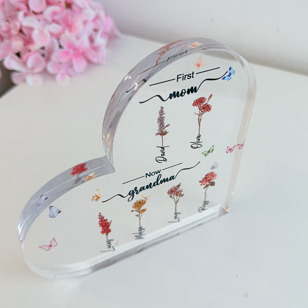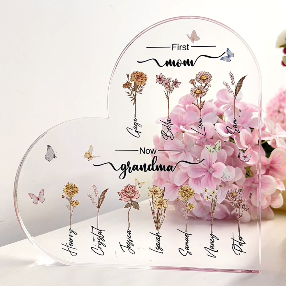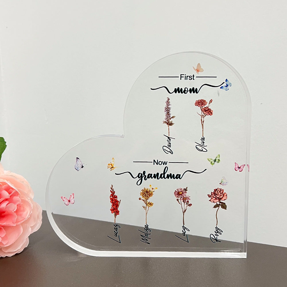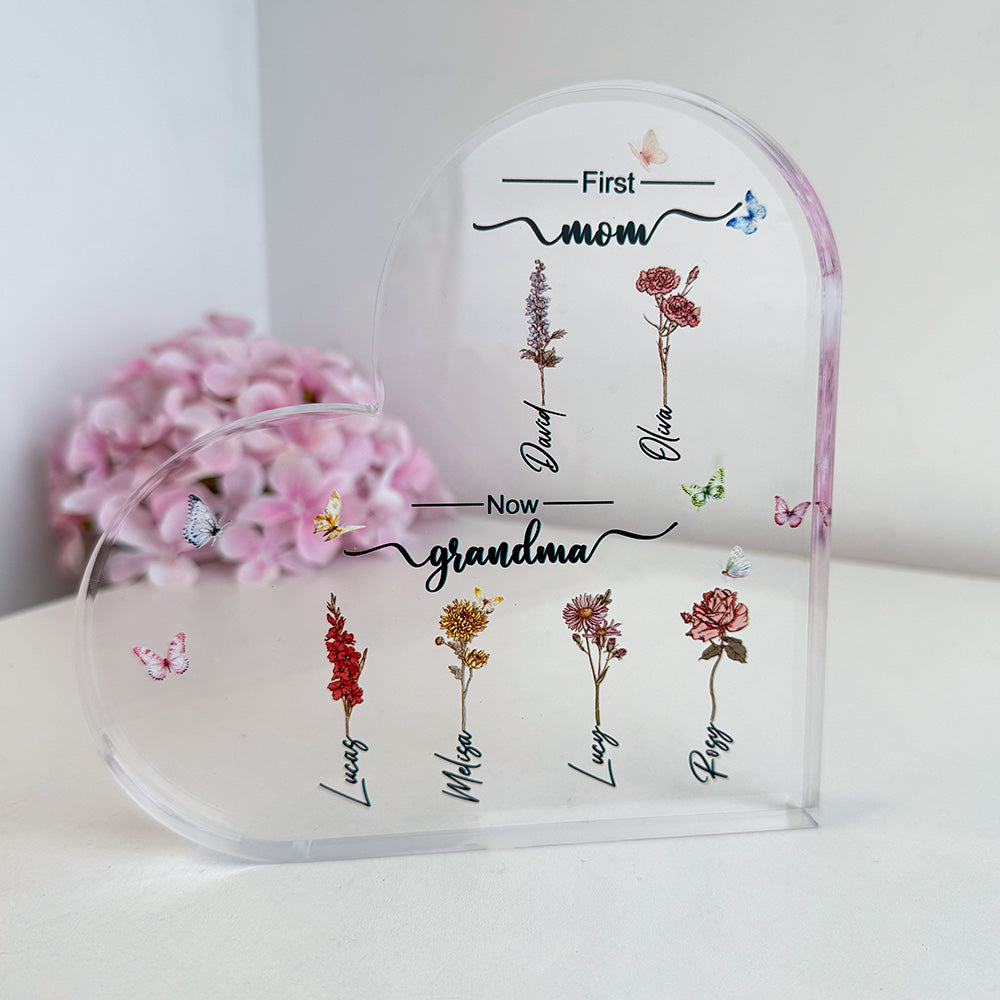 Don't be that guy who settles for mediocre gifts. Be the hero with our Custom Flower Printed First Mom Now Grandma Acrylic Plaque. Grab yours now and watch her eyes sparkle with joy!